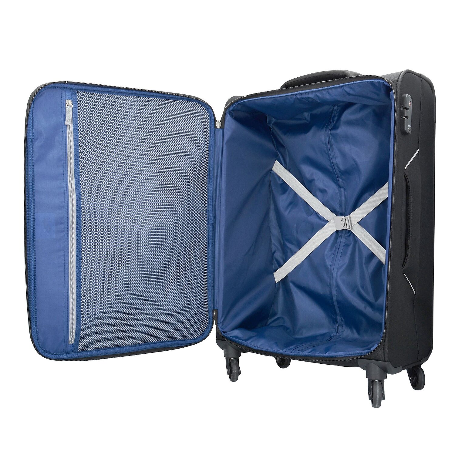 • Sprzęt: Z rączką teleskopową wysuwaną, Pasy wewnętrzne mocujące, Kieszeń siatkowa, Kieszeń na zewnątrz, Kieszeń na suwak