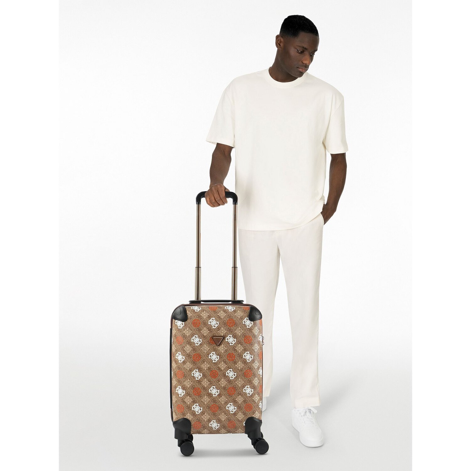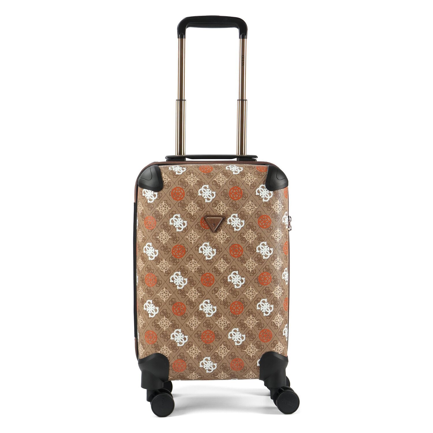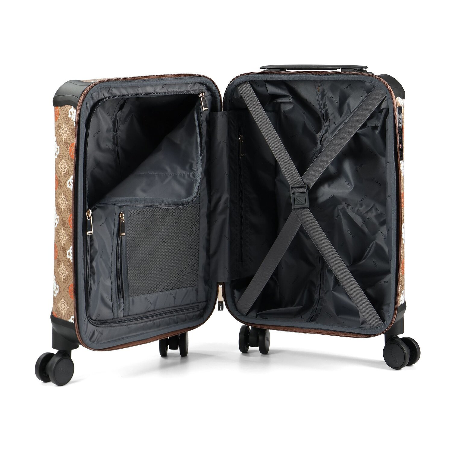 Solidny 4-kołowy wózek kabinowy marki Guess. Przestronna komora główna oferuje dużo miejsca, posiada pasek na krzyż i przegrodę na bieliznę dla optymalnej organizacji, a walizka jest również zabezpieczona zamkiem TSA. Zamykany uchwyt i cztery płynnie obracające się koła sprawiają, że ten wózek jest idealnym towarzyszem podróży.