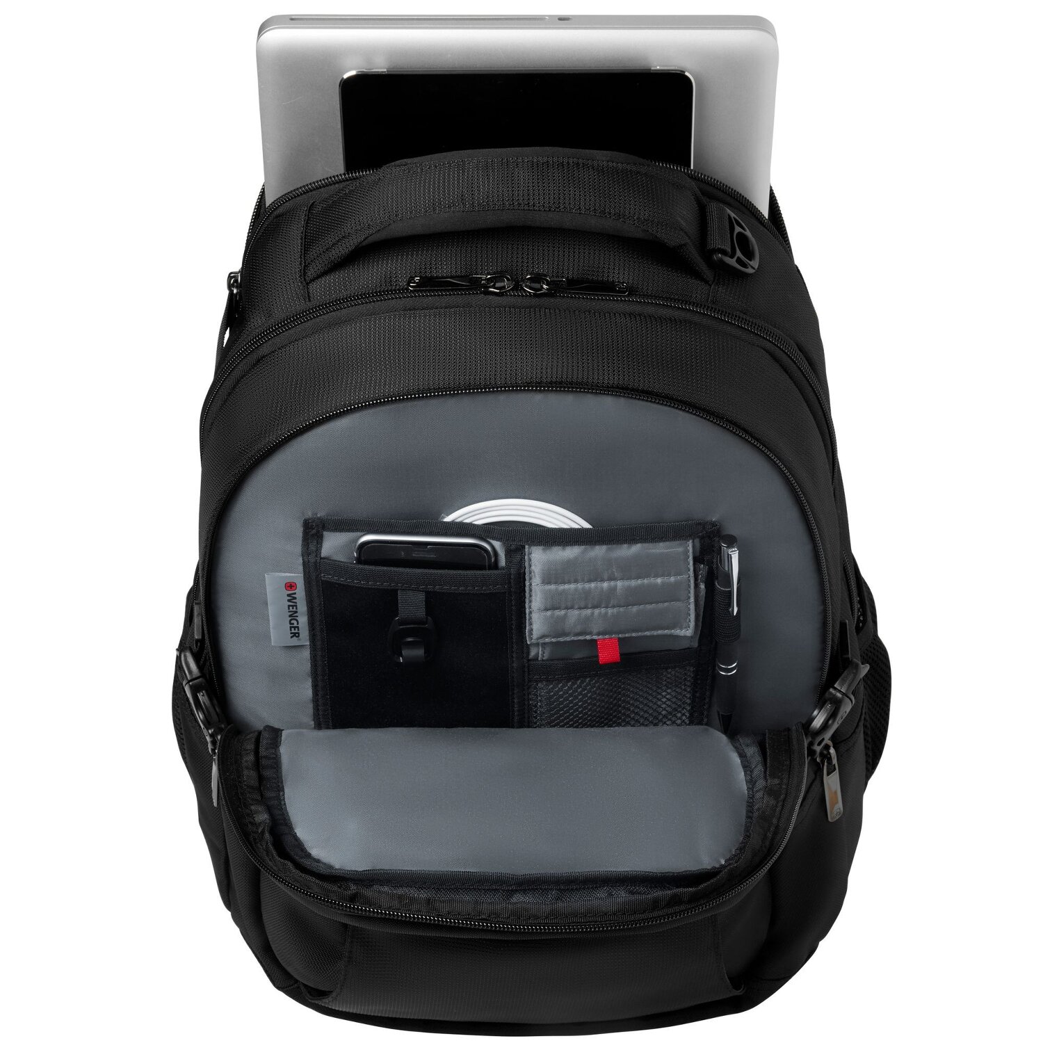 Plecak biznesowy firmy Wenger z wytrzymałego poliestru z wyściełaną przegrodą na laptop i tablet to prawdziwa oszczędność miejsca i optymalny przegląd dzięki licznym przegródkom na dokumenty, kosztowności, telefon komórkowy, długopisy i inne. Wyściełany system nośny sprawia, że jest wygodny w noszeniu.
